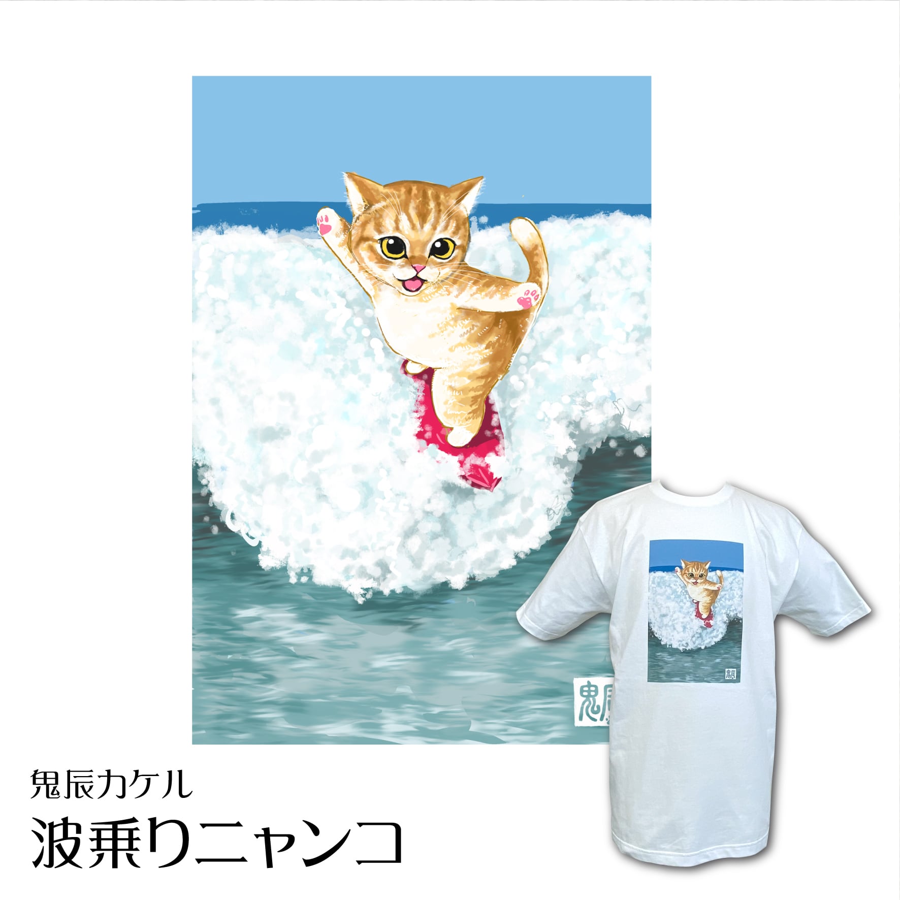 鬼辰カケル Tシャツ 波乗りニャンコ